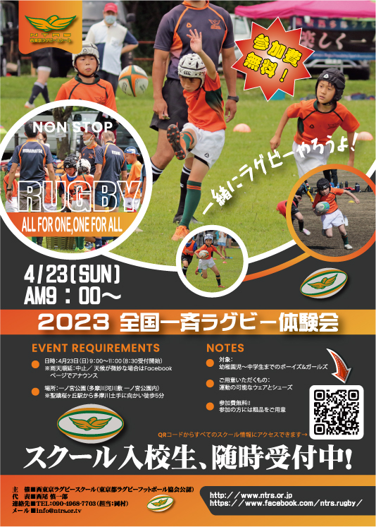 ラグビーはスポーツです、ゆえに「勝敗には真剣」にこだわります。しかしフィールドに立てる選手には制限があります。「勝敗に対する姿勢が甘い」と感じる方もいらっしゃるでしょうが、NTRSでは「全てのスクール生にラグビーを楽しんで欲しい!」という想いを大切にし、「選手の能力値や大会内容による出場時間差」など発生する可能性はありますが、基本的には試合当日に会場まで足を運んだ「全ての選手をフィールドに送り出す」ことを心がけています。試合に「勝っている時でも・負けている時でも」方針は変わりません、試合中に1度は選手を「必ず」フィールドに送り出し、そのうえで勝敗にもこだわりたいと考えます。「ラグビーを楽しんで欲しい!」、それがNTRSのスクール運営方針なのです。