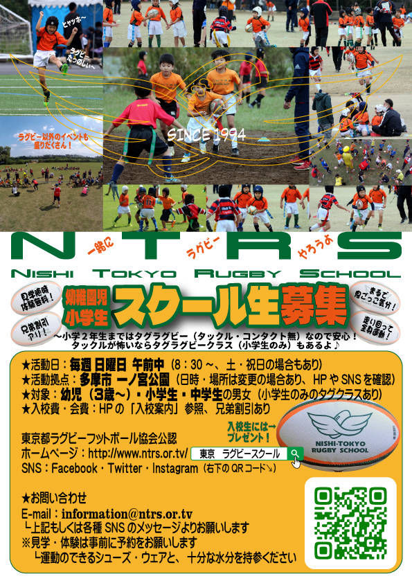 コーチ陣を保護者(ラグビー経験者多数)で形成するNTRSですが、日々更新される「プレー内容」「コーチング・レフリー技術」「安全対策」などを怠ることなく受講・導入、最新の知識と経験でスクール生を導きます。そして勝敗にこだわるスポーツですが、「可能な限り全員をフィールドへ」をモットーに、分け隔てなくスクール生にラグビーを満喫してもらえる配慮を実施しています。